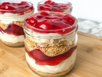 Layers of no baked and egg free cheesecake fluff, cherry sauce and crushed graham crackers.