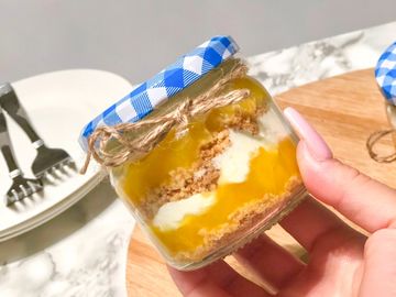 Layers of no baked and egg free cheesecake fluff, freshly cut mango with passion fruit sauce and crushed graham crackers.