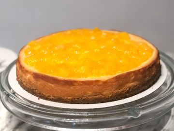 A passion fruit flavoured cheesecake with a graham cracker crust, topped off with freshly cut mangos and a passion fruit sauce