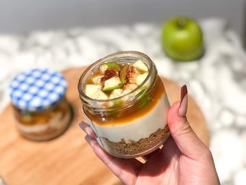 Crushed graham cracker layer with our no baked and egg free cheesecake fluff topped off with a delicious caramel sauce, chopped green apples and cinnamon spice.