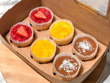 Your choice of 3 total flavours (2 each); Dulce de Leche, Strawberry or Mango Passion fruit