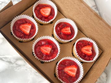 Our classic cheesecake with our crunchy graham cracker crust, topped off with a strawberry lemon sauce and a fresh strawberry halve.