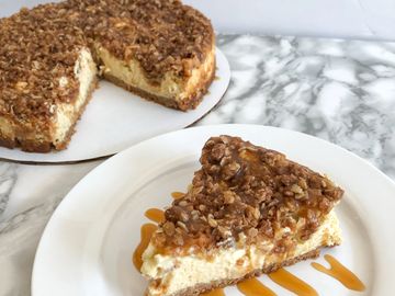 Our classic cheesecake with a graham cracker crust, topped off with a crunchy cinnamon green apple crumble and salted caramel sauce.
